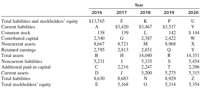 Year 2016 2017 2018 2019 2020 Total liabilities and stockholders' equity Current liabilities $13,765 F K P U A $3,420 $3,467 $3,517 V Common stock 138 139 L 142 $ 144 Contributed capital Noncurrent assets 2,340 8,667 2,795 G 2,387 8,721 2,813 2,422 8,968 Q M X Retained earnings Total assets 2,851 14,040 Y B H R 5,335 2,247 5,200 14,351 5,454 2,296 5,315 Noncurrent liabilities 5,231 I Additional paid-in capital 2,216 T current assets D J 5,275 8,929 5,314 Total liabilities 8,630 8,683 5,168 N Z Total Stockholders' equity E 5,354