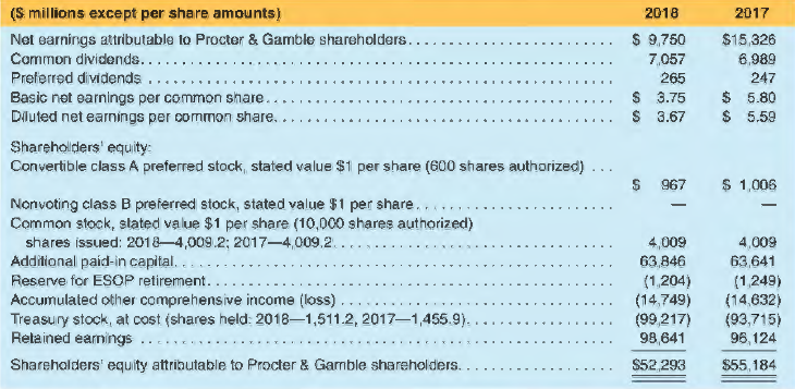 Following is the stockholders' equity section of the balance sheet for The Procter & Gamble Company along with selected earnings and dividend data. For simplicity, balances for non-controlling interests have been left out of income and shareholders' equity information.