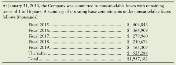 At January 31, 2015, the Company was committed to noncancelable leases with remaining terms of 1 to 16 years. A summary of operating lease commitments under noncancelable leases follows (thousands): $ 409,046 $ 366,909 $ 279,960 $ 210,674 $ 165,307 $ 525,286 $1,957,182 Fiscal 2015.. Fiscal 2016... Fiscal 2017.. Fiscal 2018.. Fiscal 2019. Thereafter Total
