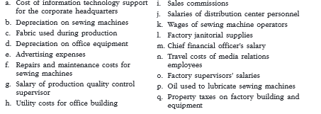 a. Cost of information technology support i. Sales commissions for the corporate headquarters j. Salaries of distribution center personnel k. Wages of sewing machine operators 1. Factory janitorial supplies m. Chief financial officer's salary b. Depreciation on sewing machines c. Fabric used during production d. Depreciation on office equipment e. Advertising expenses f. Repairs and maintenance costs for sewing machines g. Salary of production quality control supervisor n. Travel costs of media relations employees o. Factory supervisors' salaries p. Oil used to lubricate sewing machines q. Property taxes on factory building and equipment h. Utility costs for office building