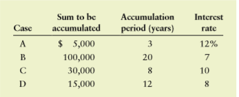 Sum to be Accumulation Interest Case accumulated period (ycars) rate A $ 5,000 3 12% B 100,000 20 7 C 30,000 8 10 D 15,000 12