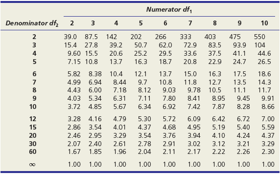 For each data set, use Hartleyâs test to test the hypothesis of equal variances, using the 5 percent table of critical values from Table 11.5 and the largest and smallest sample variances from your previous ANOVA. Optional challenge: If you have access to MINITAB or another software package, perform Leveneâs test for equal group variances, discuss the p-value, and interpret the graphical display of confidence intervals for standard deviations.