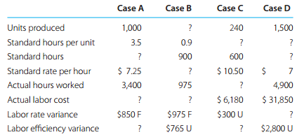 Case A Case B Case C Case D Units produced 1,000 ? 240 1,500 Standard hours per unit 3.5 0.9 ? Standard hours ? 900 600 Standard rate per hour $ 7.25 $ 10.50 7 Actual hours worked 3,400 975 4,900 Actual labor cost $ 6,180 $ 31,850 Labor rate variance $850 F $975 F $300 U ? Labor efficiency variance $765 U $2,800 U