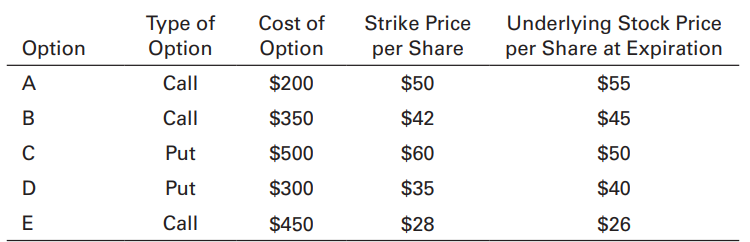 For each of the 100-share options shown in the following table, use the underlying stock price at expiration and other information to determine the amount of profit or loss an investor would have had, ignoring brokerage fees.