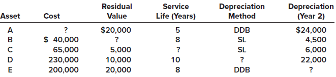 For each of the following depreciable assets, determine the missing amount (?). Abbreviations for depreciation methods are SL for straight-line and DDB for double-declining-balance. Property, Plant, and Equipment and Intangible Assets: Utilization and Disposition