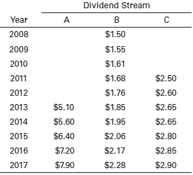 For each of the following streams of dividends, estimate the compound annual rate of growth between the earliest year for which a value is given and 2017.