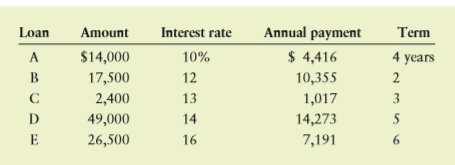 Loan Amount Interest rate Annual payment Term A $14,000 10% $ 4,416 4 years B 17,500 12 10,355 2 2,400 13 1,017 3 49,000 26,500 D 14 14,273 5 E 16 7,191