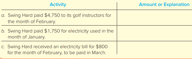 > The following transactions are February activities of Swing Hard Incorporated, which offers indoor golfing lessons in the northeastern United States. If an expense is to be recognized in February, indicate the amount. If an expense is not to be recognize