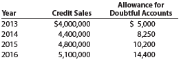 Allowance for Doubtful Accounts Year Credit Sales $4,000,000 $ 5,000 2013 2014 4,400,000 4,800,000 5,100,000 8,250 10,200 14,400 2015 2016