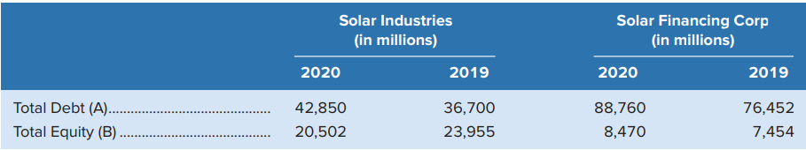 For Solar Industries and its related but separate financing company Solar Financing Corp, calculate the debt to equity ratio for 2019 and 2020. Explain why there are such significant differences in the ratios.