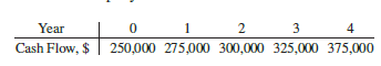 Year 0 1 2 3 4 Cash Flow, $ 250,000 275,000 300,000 325,000 375,000