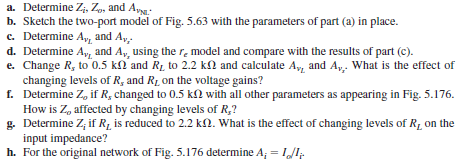 > Using the model of Fig. 5.16, determine the following for a common-emitter amplifier if b = 80, IE (dc) = 2 mA, and ro = 40 kΩ. a. Zi. b. Ib. c. Ai = Io>Ii = IL>IB if RL = 1.2 kΩ. d. Av if RL = 1.2 kΩ.
