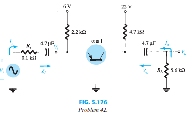 > The input impedance to a common-emitter transistor amplifier is 1.2 kΩ with b = 140, ro = 50 kΩ, and RL = 2.7 kΩ. Determine: a. re. b. Ib if VI = 30 mV. c. Ic. d. Ai = Io>Ii = IL>Ib. e. Av = VO>VI.