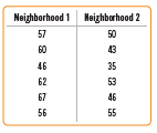 A developer wants to know if the houses in two different neighborhoods were built at roughly the same time. She takes a random sample of six houses from each neighborhood and finds their ages from local records. The table shows the data for each sample (in years).