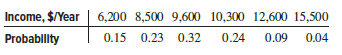 For the income and probability values shown, the probability that the income in any year will be greater than $8500 is closest to:
