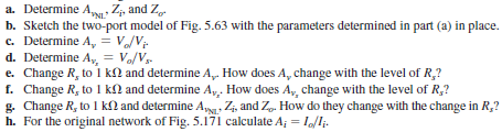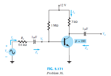 > The input impedance to a common-emitter transistor amplifier is 1.2 kΩ with b = 140, ro = 50 kΩ, and RL = 2.7 kΩ. Determine: a. re. b. Ib if VI = 30 mV. c. Ic. d. Ai = Io>Ii = IL>Ib. e. Av = VO>VI.