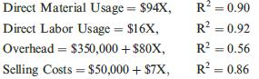 Direct Material Usage = $94X, R? = 0.90 Direct Labor Usage = $16X, R? = 0.92 Overhead = $350,000 + $80X, R? = 0.56 %3D %3D Selling Costs = $50,000 + $7X, R? = 0.86