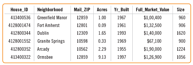 House_ID Neighborhood Mail_ZIP Acres Yr_Built Full_Market_Value Size 413400536 Greenfield Manor 12859 1.00 1967 $1,00,400 960 4128001474 Fort Amherst 12801 0.09 1961 $1,32,500 906 412800344 Dublin 12309 1.65 1993 $1,40,000 1620 4128001552 Granite Springs 10598 0.33 1969 $67,100 900 412800352 Arcady 10562 2.29 1955 $1,90,000 1224 413400322 Ormsbee 12859 9.13 1997 $1,26,900 1056