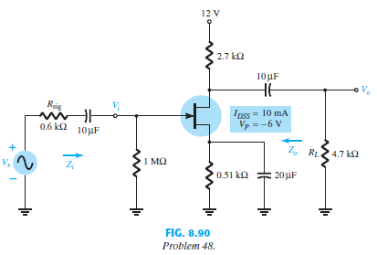 > For the source-follower network of Fig. 8.91: a. Determine AvNL, Zi, and Zo. b. Sketch the two-port model of Fig. 5.75 with the parameters determined in part (a) in place. c. Determine AvL and Avs. d. Change RL to 4.7 kΩ and calculate