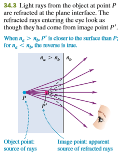 34.3 Light rays from the object at point P are refracted at the plane interface. The refracted rays entering the eye look as though they had come from image point P'. When n, > n, P' is closer to the surface than P; for n, < n, the reverse is true. Object point: source of rays Image point: apparent source of refracted rays