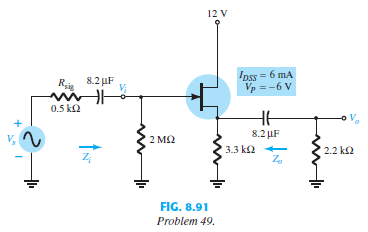 > For the self-bias JFET network of Fig. 8.90: a. Determine AvNL, Zi, and Zo. b. Sketch the two-port model of Fig. 5.75 with the parameters determined in part (a) in place. c. Determine AvL and Avs. d. Change Rsig to 10 kΩ and calculate