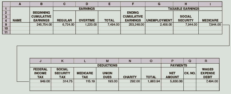 A B D E F G H 1 EARNINGS TAXABLE EARNINGS BEGINNING ENDING 3. CUMULATIVE CUMULATIVE SOCIAL 4 NAME EARNINGS REGULAR OVERTIME ТОTAL EARNINGS UNEMPLOYMENT SECURITY MEDICARE 245,754.00 6,724.00 1,220.00 7,494.00 253,248.00 2,456.00 7,944.00 7,944.00 10 11 J K L M N P R DEDUCTIONS PAYMENTS FEDERAL SOCIAL WAGES INCOME SECURITY MEDICARE UNION NET CK. NO. EXPENSE ТАХ TAX 314.75 TAX DUES CHARITY ТОTAL AMOUNT DEBIT 949.00 115.19 193.00 292.00 1,863.94 5,630.06 7,494.00