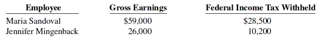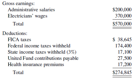 Gross earnings: Administrative salaries $200,000 370,000 Electricians' wages Total $570,000 Deductions: FICA taxes $ 38,645 Federal income taxes withheld State income taxes withheld (3%) United Fund contributions payable Health insurance premiums 174,400 17,100 27,500 17,200 Total $274,845 Wages, Tips, Other Compensation Federal Income State Income FICA FICA Tax Tax Withheld Tax Withheld Wages Withheld Employee Gross Earnings Federal Income Tax Withheld Maria Sandoval $28,500 $59,000 26,000 Jennifer Mingenback 10,200