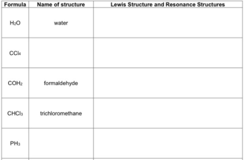 Formula Name of structure Lewis Structure and Resonance Structures H:0 water COH2 formaldehyde CHCI trichloromethane PH3
