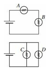 Four identical incandescent lightbulbs are placed in two different circuits with identical batteries. Bulbs A and B are connected in series with the battery. Bulbs C and D are connected in parallel across the battery.