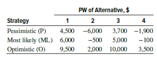 > Four mutually exclusive alternatives are evaluated using three estimates or strategies (pessimistic, most likely, and optimistic) for several parameters. The resulting PW values over the LCM are determined as shown. If none of the strategies is more like