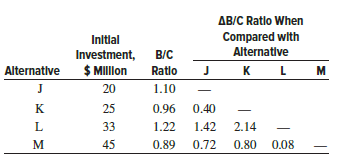 Four mutually exclusive, direct benefit alternatives are compared using the B/C method. Which alternative, if any, should be selected?
