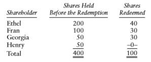 Four unrelated shareholders own Benton Corporationâs 400 shares of outstanding stock. As indicated below, Benton redeems a total of 100 shares for $500 per share from three of its shareholders. Each shareholder has a $230 per share basis in his or her stock. Bentonâs current and accumulated E&P at the end of the tax year is $150,000.