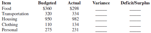 Fran Powers created the following budget and reported the actual spending listed. Calculate the variance for each of these categories, and indicate whether it was a deficit or a surplus.