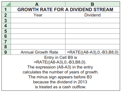 From 2013 to 2018, Beer Brothers, Inc., paid dividends of $2.29, $2.36, $2.44, $2.48, $2.54, and $2.61. Use an Excel spreadsheet like the template shown to find Brotherâs historical dividend growth rate.