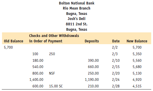 Bolton National Bank Rio Mean Branch Bugna, Texas Josh's Deli 8811 2nd St. Bugna, Texas Checks and Other Withdrawals Old Balance in Order of Payment Deposits Date New Balance 5,700 2/2 5,700 100 250 2/3 5,350 180.00 390.00 2/10 5,560 540.00 660.00 2/15 5,680 800.00 NSF 250.00 2/20 5,130 1,400.00 1,190.00 2/24 4,920 600.00 15.00 SC 210.00 2/28 4,515