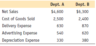 Dept. A Dept. B Net Sales $4,600 $6,300 Cost of Goods Sold 2,500 2,400 Delivery Expense 630 870 Advertising Expense 540 620 Depreciation Expense 330 380