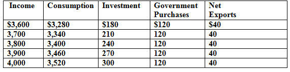 > From the following data, construct an expenditure schedule on a piece of graph paper. Then use the income-expenditure (45° line) diagram to determine the equilibrium level of GDP. Now suppose investment spending rises to $260, and the price le