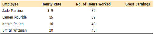 Employee Hourly Rate No. of Hours Worked Gross Earnings Jade Martina $ 9 50 Lauren McBride 15 39 Natala Polino 16 40 Dmitri Wittman 20 46