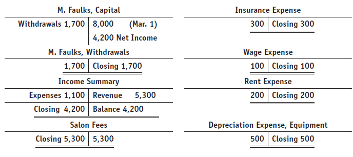M. Faulks, Capital Insurance Expense Withdrawals 1,700 8,000 (Mar. 1) 300 Closing 300 4,200 Net Income M. Faulks, Withdrawals Wage Expense 1,700 Closing 1,700 100 Closing 100 Income Summary Rent Expense Expenses 1,100 Revenue 5,300 200 Closing 200 Closing 4,200 Balance 4,200 Salon Fees Depreciation Expense, Equipment Closing 5,300 5,300 500 Closing 500
