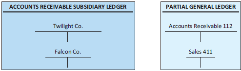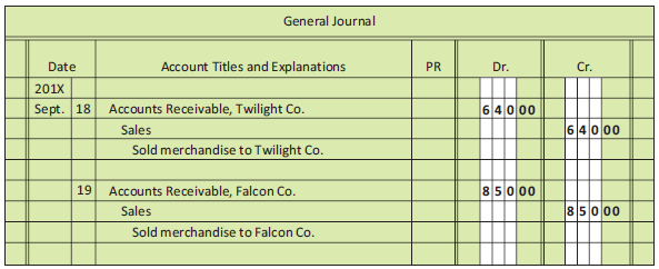 General Journal Date Account Titles and Explanations PR Dr. Cr. 201X Sept. 18 Accounts Receivable, Twilight Co. 64000 Sales Sold merchandise to Twilight Co. 6 4000 19 Accounts Receivable, Falcon Co. 85000 Sales 85000 Sold merchandise to Falcon Co. ACCOUNTS RECEIVABLE SUBSIDIARY LED GER PARTIAL GENERAL LEDGER Twilight Co. Accounts Receivable 112 Falcon Co. Sales 411