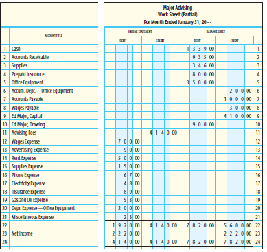 Major Advising Work Sheet (Partlal) For Month Ended January 31, 20 -- IIE MALANIS 1339 00 935 00 3 46 00 800 00 3500 00 1 Can 2 Acounts Recehable 3 Supplies 4 Prepald Insurance 5 omce Equipment 6 Accum. Dept-omce Equipment 7 Accounts Payable 8 Wages Payabie 9 Ed Majot, Capital 10 Ed Major, Drawing 11 Advising Fees 12 Wages Expense 13 Advertsing Experse 14 Rent Experse 15 Supplies Experse 16 Phone Eapense 17 Electicity Expense 18 insurance Expense 19 Gs and O Experse 20 Depr. Expenseomce Equipment 21 Miscellaneous Experse 22 2 3 4 20 0 00 6 1000 00 7 30 0 00 8 4100 00 9 900 00 10 4140 00 11 700 00 90 00 50 0 00 150 00 6기001 12 13 14 15 16 48 00 17 89 00 53 00 18 19 200 00 20 23 00 21 5600 00 22 12|2이100| 23 782 이100| 24 7820 00 19 20 00 22 20 00 4140 00 4140 00 23 Net Income 24 41 40 00 7820 00