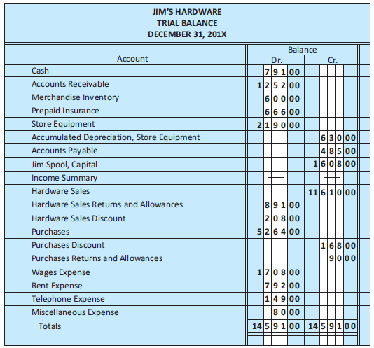 JIM'S HARDWARE TRIAL BALANCE DECEMBER 31, 201X Balance Account Dr. Cr. Cash 79100 125200 6 00 00 |6 66 00 2190 00 Accounts Receivable Merchandise Inventory Prepaid Insurance Store Equipment Accumulated Depreciation, Store Equipment 63000 48500 Accounts Payable Jim Spool, Capital 160800 Income Summary Hardware Sales 1161000 89100 208 00 Hardware Sales Returns and Allowances Hardware Sales Discount Purchases 526400 Purchases Discount 16800 Purchases Returns and Allowances 9000 1708 00 79200 149 00 |8|000 Wages Expense Rent Expense Telephone Expense Miscellaneous Expense Totals 14 5 9100 1459100
