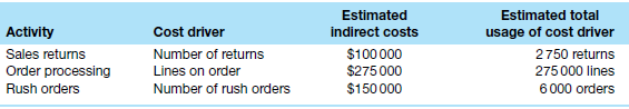 Activity Sales returns Order processing Rush orders Cost driver Number of returns Lines on order Number of rush orders Estimated indirect costs $100 000 $275 000 $150 000 Estimated total usage of cost driver 2750 returns 275 000 lines 6000 orders