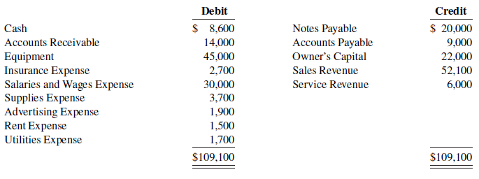 Debit Credit Cash $ 8,600 $ 20,000 Notes Payable Accounts Payable Owner's Capital Accounts Receivable 14,000 9,000 Equipment Insurance Expense Salaries and Wages Expense Supplies Expense Advertising Expense Rent Expense Utilities Expense 45,000 22,000 2,700 Sales Revenue 52,100 30,000 3,700 Service Revenue 6,000 1,900 1,500 1,700 $109,100 $109,100