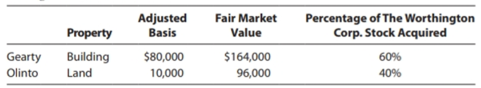 Gearry and Olinto organized The Worthington Corp., which issued voting common stock with a fair market value of $240,000. They each transferred property in exchange for stock as follows: