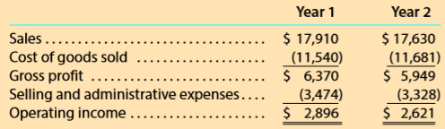 Year 1 Year 2 $ 17,910 (11,540) $ 6,370 (3,474) $ 2,896 $ 17,630 (11,681) $ 5,949 (3,328) $ 2,621 Sales ....... Cost of goods sold Gross profit .... Selling and administrative expenses.. Operating income..