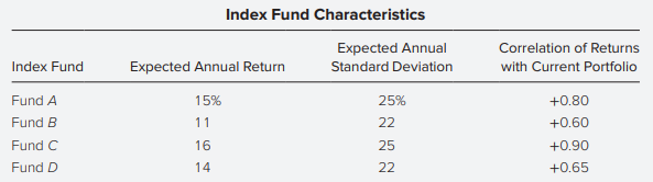 Stephenson soon expects to receive an additional $2 million and plans to invest the entire amount in an index fund that best complements the current portfolio. Stephanie Coppa, CFA, is evaluating the four index funds shown in the following table for their ability to produce a portfolio that will meet two criteria relative to the current portfolio: (1) maintain or enhance expected return and (2) maintain or reduce volatility.