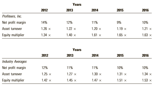Years 2012 2013 2014 2015 2016 Profiteers, Inc. Net profit margin 14% 12% 11% 9% 10% Asset-turnover' data-toggle="tooltip" data-placement="top" title="Click to view definition...">Asset Turnover 1.26 x 1.22 x 1.20 x 1.19 x 1.21 x Equity-multiplier' data-toggle="tooltip" data-placement="top" title="Click to view definition...">Equity Multiplier 1.34 x 1.40 x 1.61 x 1.65 x 1.63 x Years 2012 2013 2014 2015 2016 Industry Averages Net profit margin 12% 11% 11% 10% 10% Asset turnover 1.25 x 1.27 x 1.30 x 1.31 x 1.34 x Equity multiplier 1.42 x 1.45 x 1.47 x 1.51 x 1.53 x