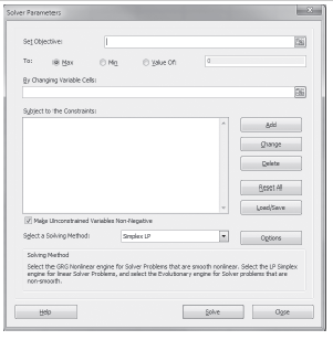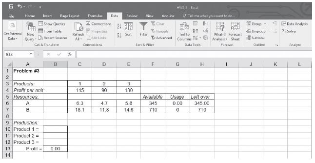 Given the following Excel spreadsheet for a linear programming model and Solver Parameters window, indicate the formula for cell B13 and fill in the Solver Parameters window with the appropriate information to solve the problem: