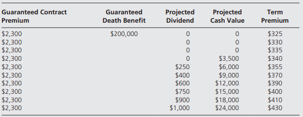 Guaranteed Contract Guaranteed Projected Dividend Projected Cash Value Term Premium Death Benefit Premium $2,300 $2,300 $2,300 $2,300 $2,300 $2,300 $2,300 $2,300 $2,300 $2,300 $200,000 $325 $330 $335 $340 $3,500 $6,000 $9,000 $12,000 $15,000 $18,000 $24,000 $250 $355 $400 $600 $370 $390 $750 $400 $900 $1,000 $410 $430